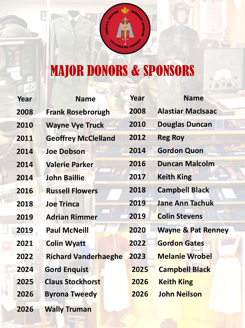 The Ashton Armoury Museum Donors and Sponsors Recognition Plaque contains the names of the museum’s major donors and sponsors, i.e., value of donation or sponsorship is $500 or more.
